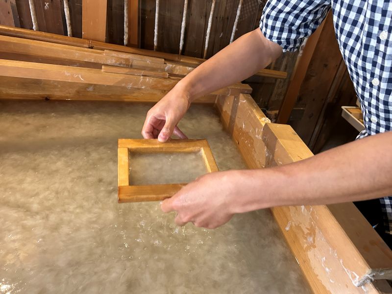 江戸時代は加賀藩の奉書紙を生産していた地域であった金沢市二俣町から移築された紙漉き農家で行う紙漉き体験です。