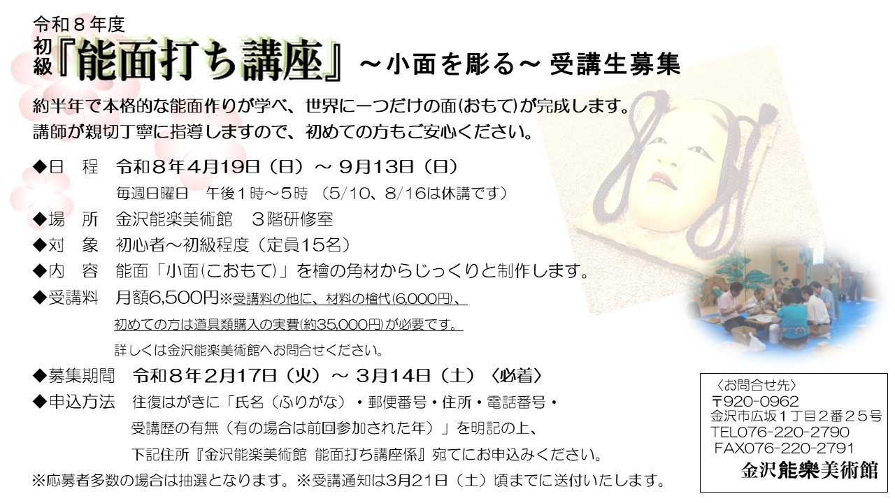 往復はがきに必要事項を明記の上、下記住所『金沢能楽美術館 能面打ち講座係』宛てにお申込みください。