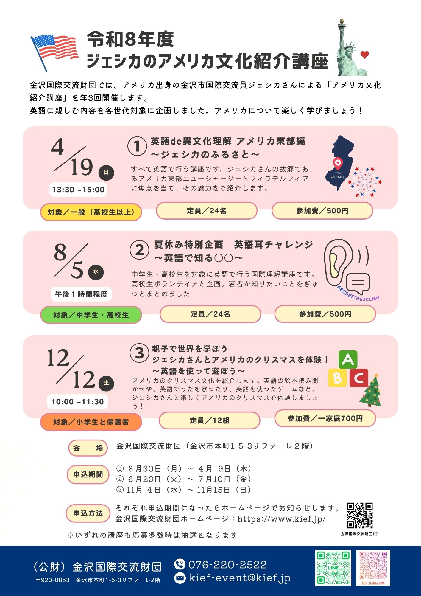 金沢国際交流財団では、アメリカ出身国際交流員のジェシカさんによる「アメリカ文化紹介講座」を年3回開催します。
