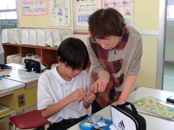 5年生の家庭科で初めて針を持ち、地域の婦人会の方に教えていただきながら、玉結び、玉止めに挑戦しました。
