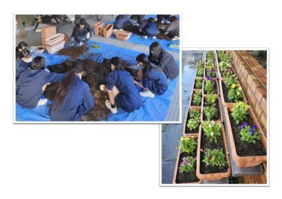 今年も、春に新入生を迎える準備としてパンジー80株をプランターと中庭に植え、プランターは生徒玄関前に設置した。当日は、「以前から花植えのチラシを見て気になっていた」という地域の方も飛び入り参加し、参加者皆が声をかけながら和気あいあいと土の再生作業や花植えを実施した。
