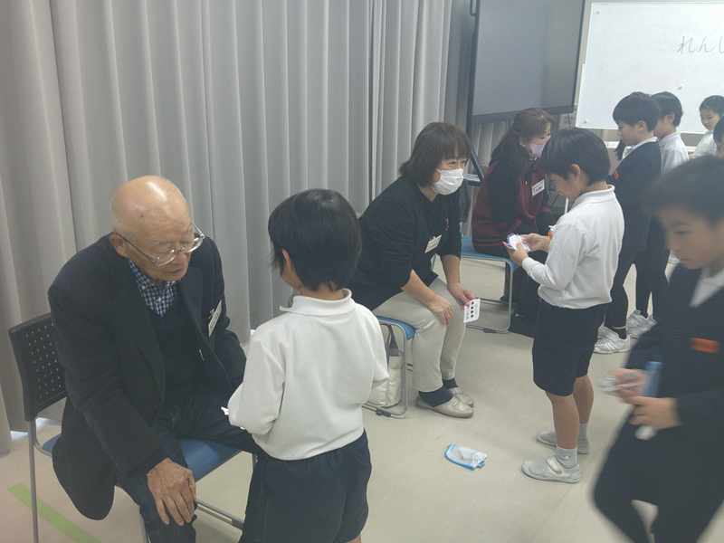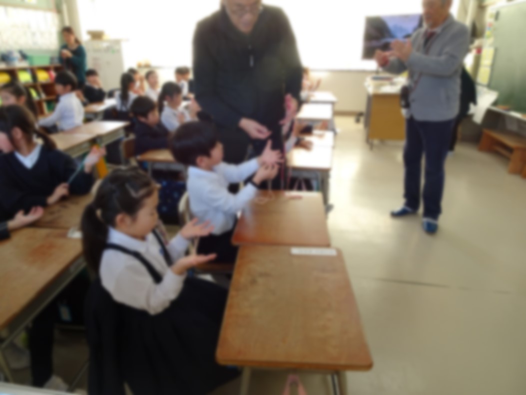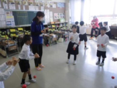 粟崎公民館のボランティアの方から、けん玉・コマ回し・おてだま・おはじきの4種類の昔遊びについて教えていただいた。