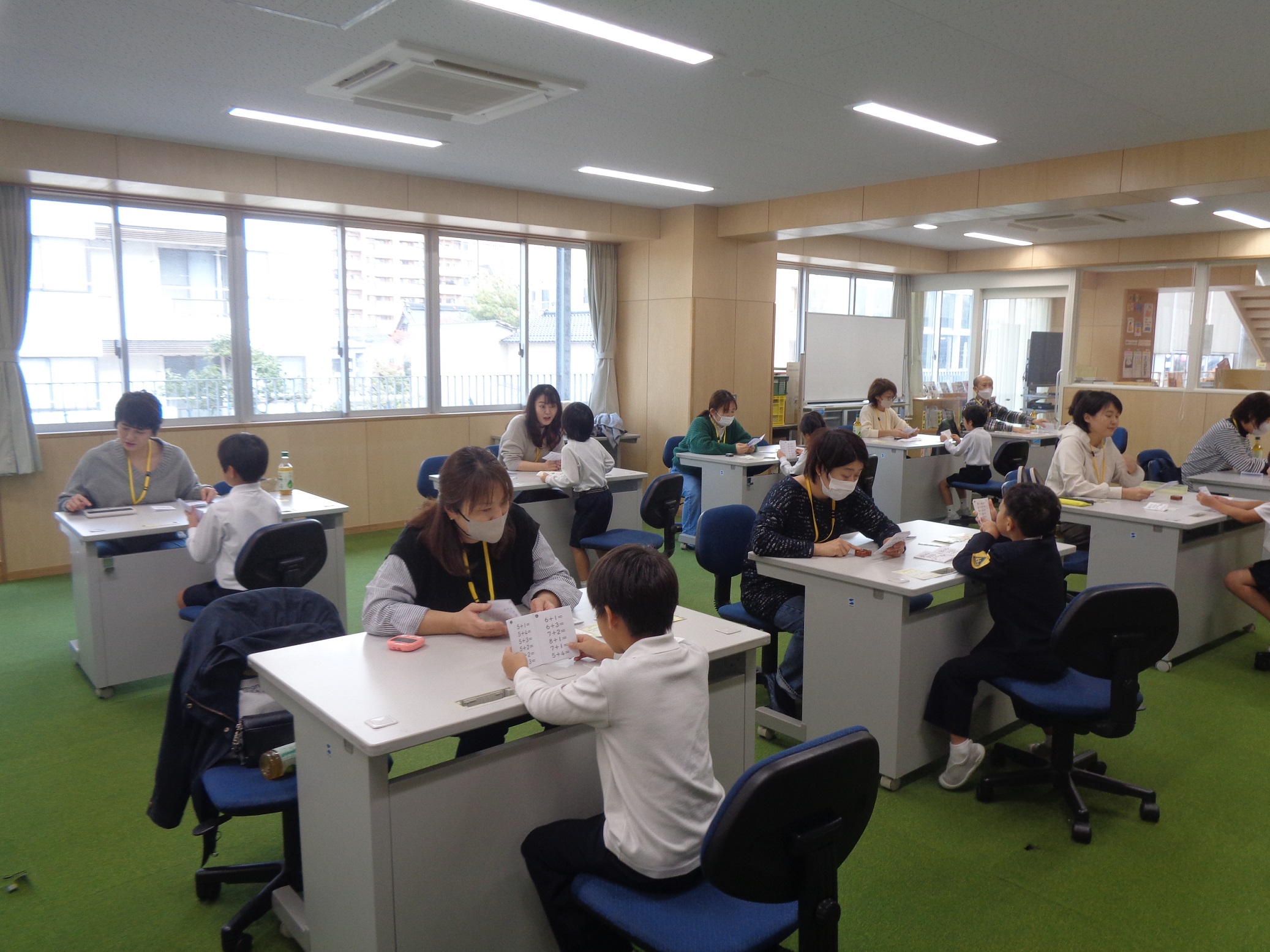 たし算やひき算を時間内に正確に唱えることができるか、地域コーディネーターや地域ボランティアの方々に聞いてもらいました。たしざんとひきざんのカードを選び、「1+3=4」「5ー3=2」などすらすらと答えが言えるか挑戦しました。つまずいたらもう1度挑戦。合格するまで、何度も挑戦していました。