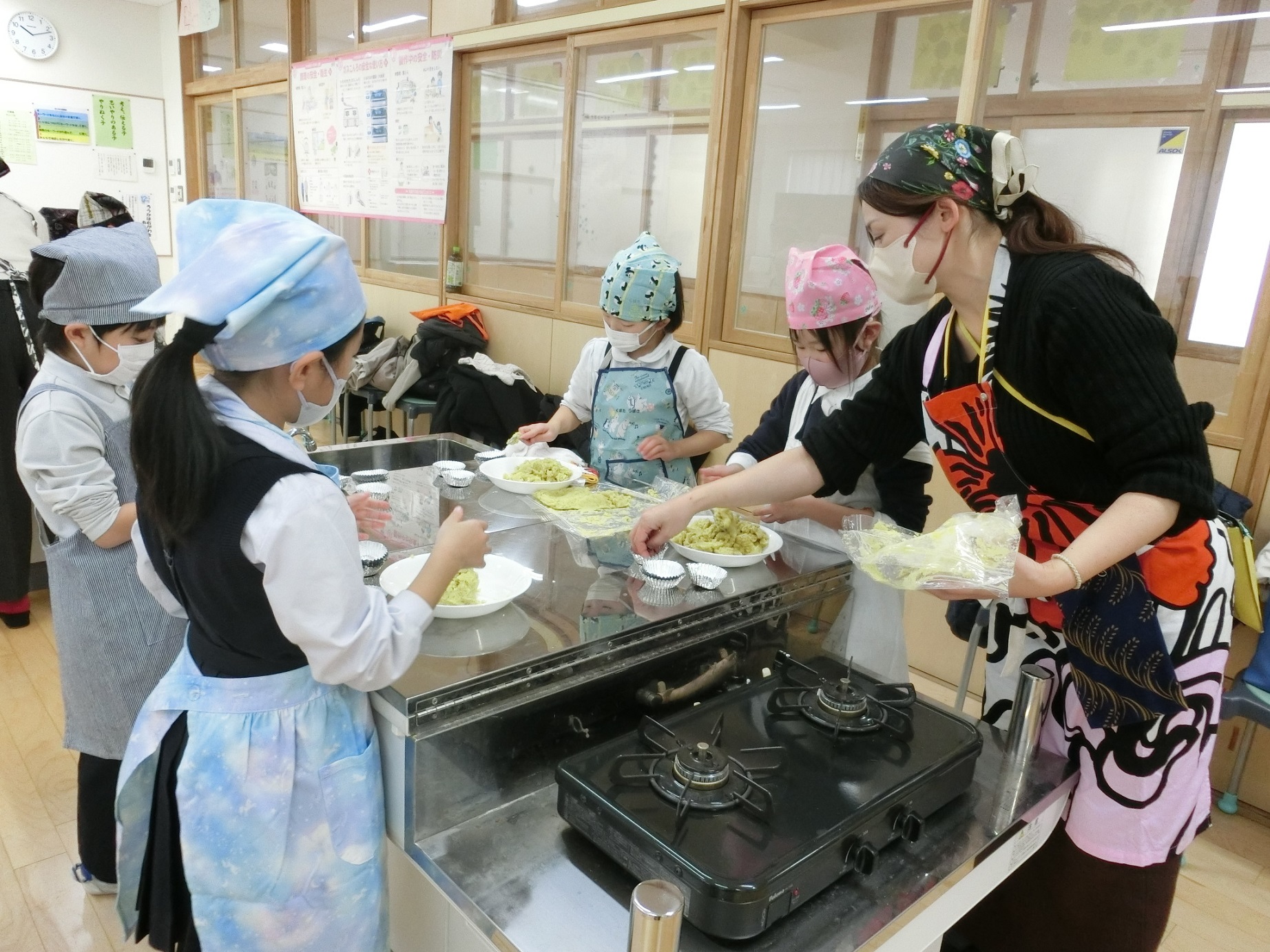 生活科の「おいしい やさいを そだてよう」の学習で育ててきたさつまいも。秋に収穫したさつまいもを使ってスイートポテトを作り、秋の味覚を楽しみました。ボランティアの方々には、下ごしらえ(皮むき・切る・茹でる)を行っていただくとともに、子どもたちと一緒に調理・会食をしていただきました。