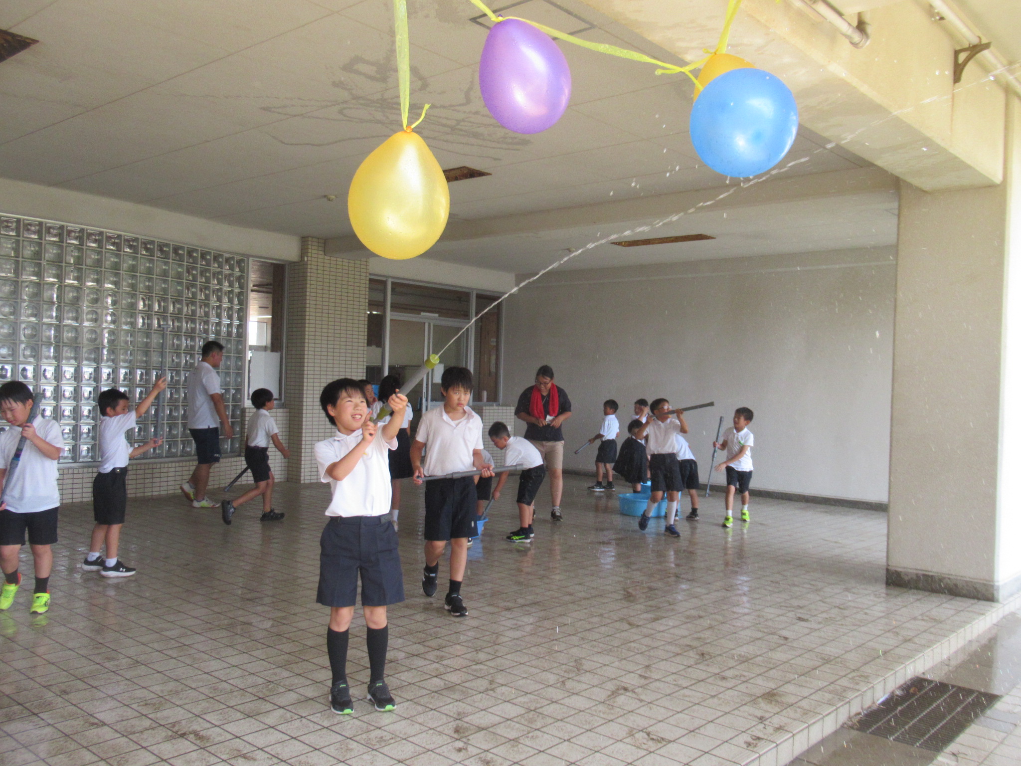 塩化ビニル管を使って水鉄砲を作成した。完成してからは中庭に用意された的を狙って水鉄砲遊びをした。