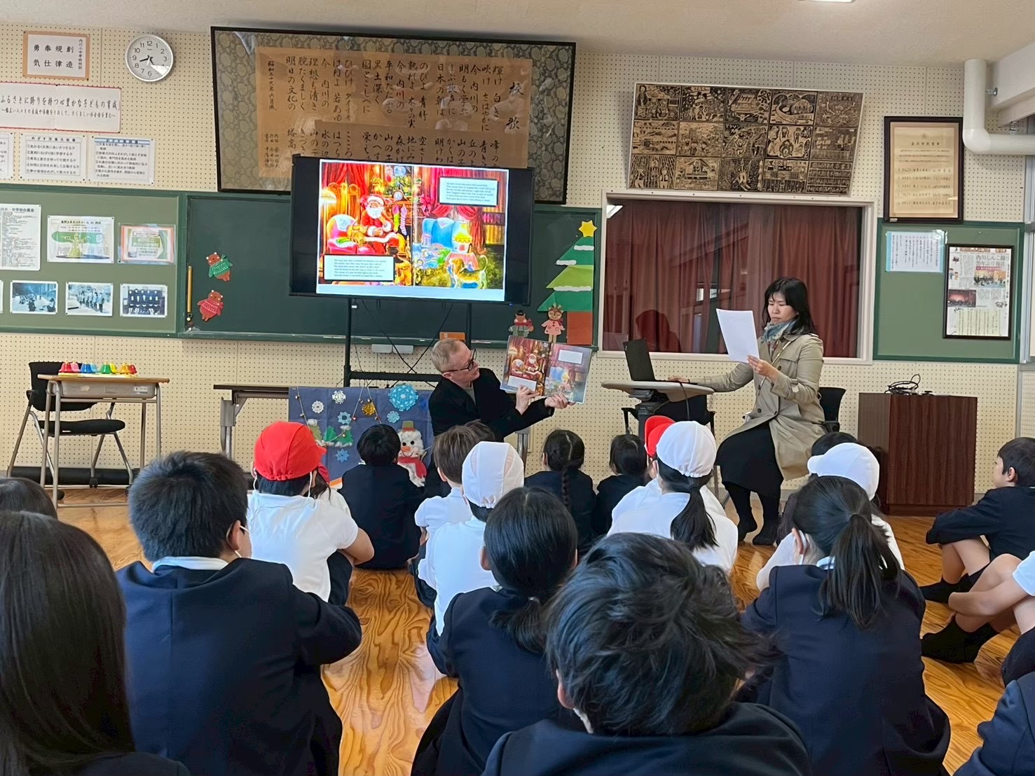 ・冬のおはなし会では、外国の冬の過ごし方を学んだり、バイオリン等の楽器演奏を聴いたり、クリスマスの絵本を味わったりしました。冬の楽しいひとときをみんなで過ごす、恒例行事になっています。目的は、過疎地区では不足しがちな、国際的視野・芸術性・文化性等を、幼少期から子どもたちに持ってもらうことにあります。