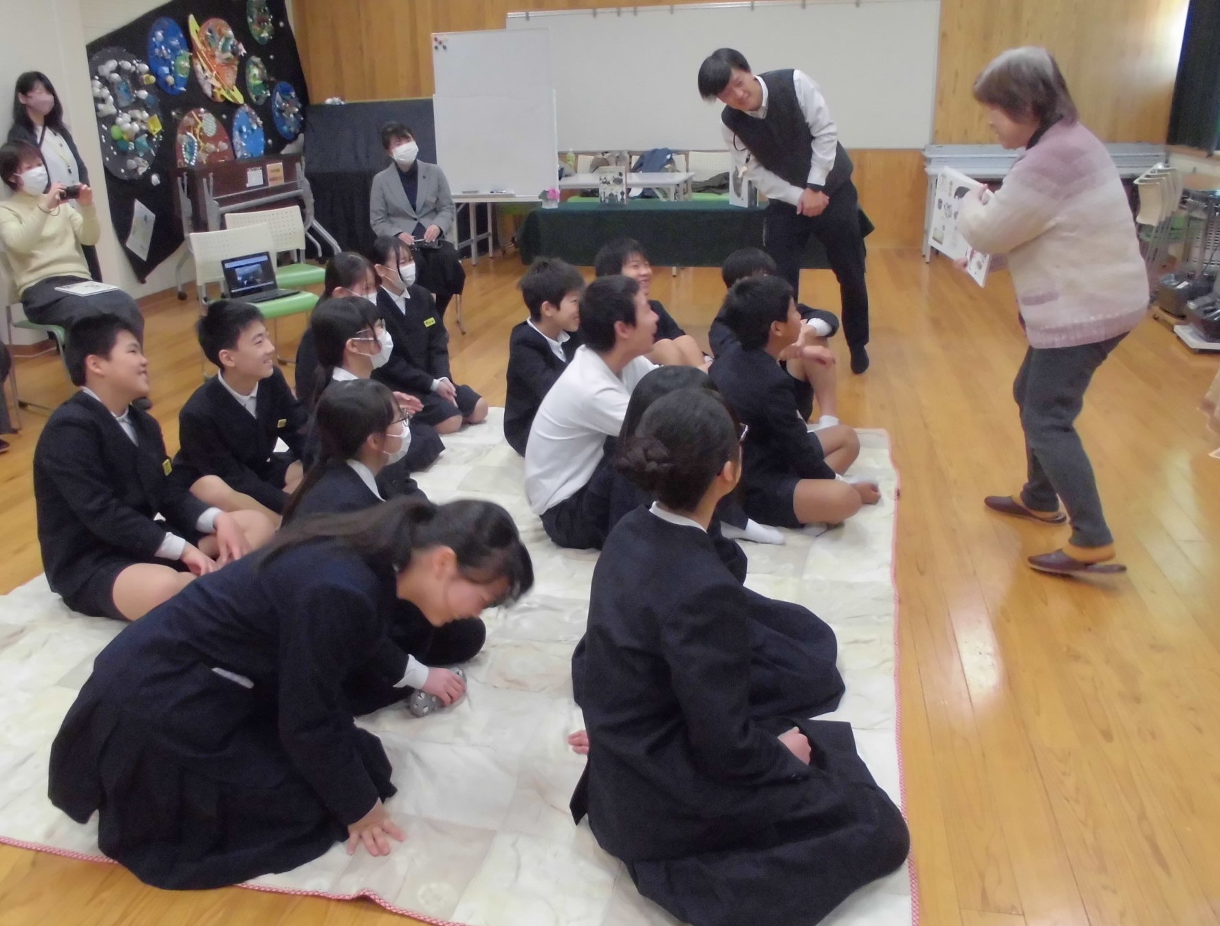 ・1年生46名と一緒にむかし遊びを楽しむ。