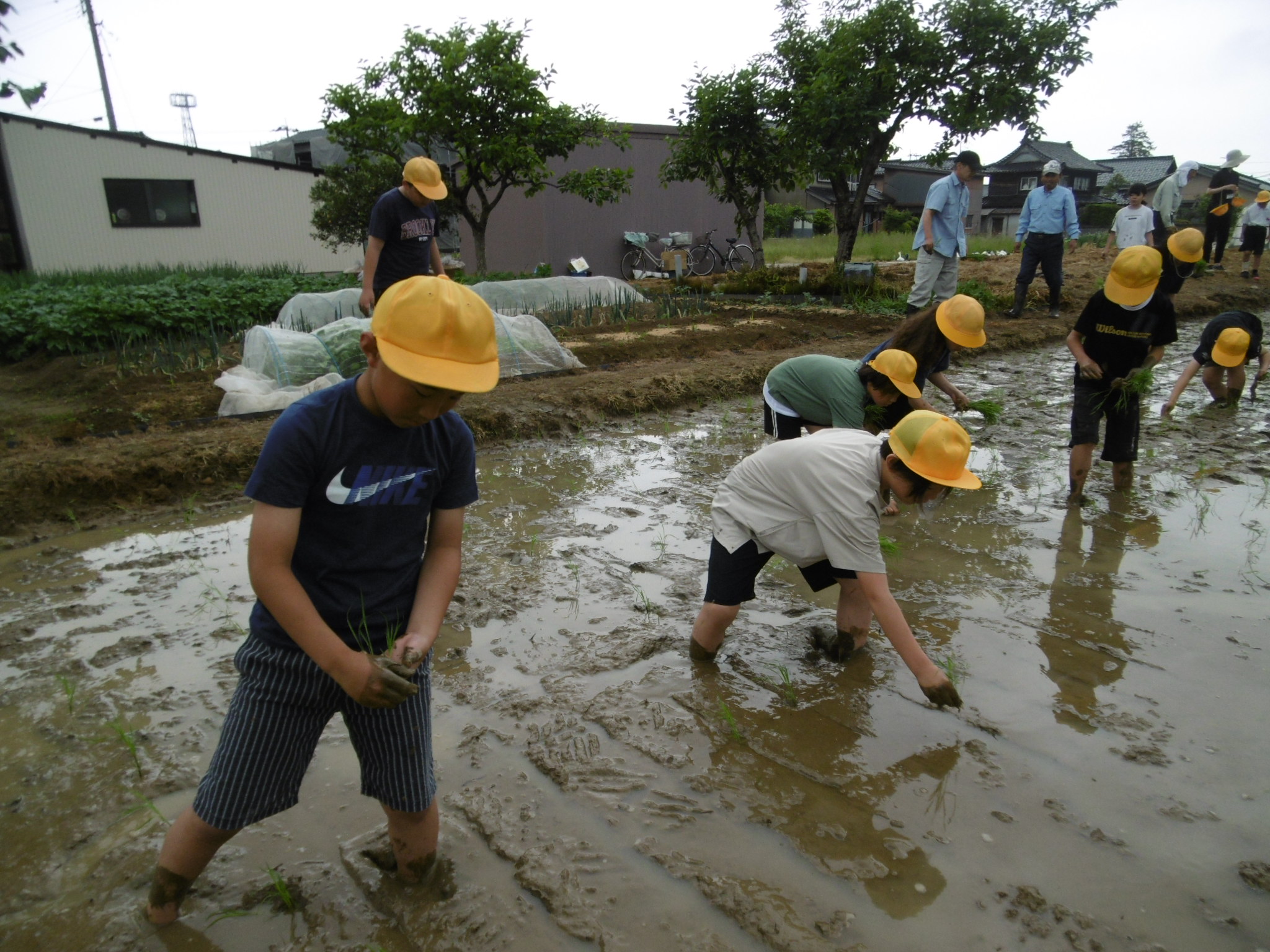 5年生の総合的な学習、社会科の授業で1年を通して田んぼでの米作り体験を行った。地域には、多くの田んぼがあるが、実際に田植えをしたことがある児童は、ほとんどおらず、地域の老人会の皆様の手助けのもと、貴重な体験をすることができた。