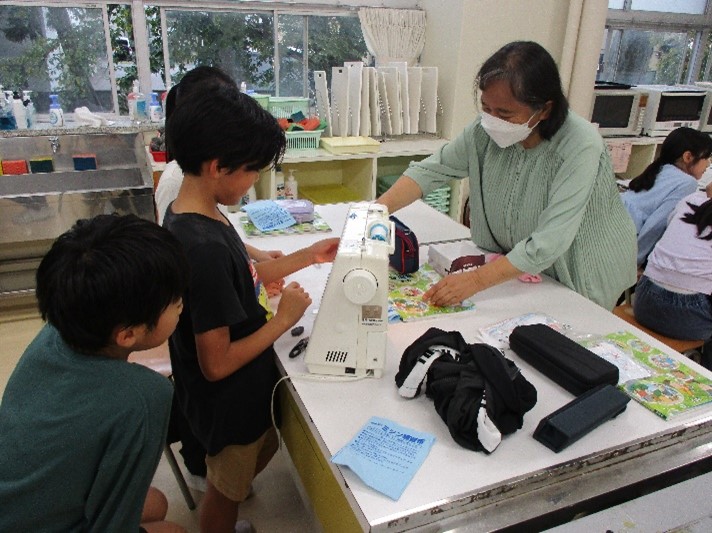・ミシンの達人に教えをいただきながら5年生にとって初めてのミシンを使っての製作を行った。